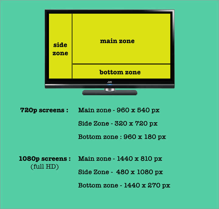 The main zone dimension of this layout is 960x540/1440x810 ie they have an aspect ratio of 16:9. So any image/video asset with this aspect ratio can be used here. For example assets designed for Layout 1 can be used in Main zone of layout 3a. (Also in main zones of layouts 3b,3c,3d)