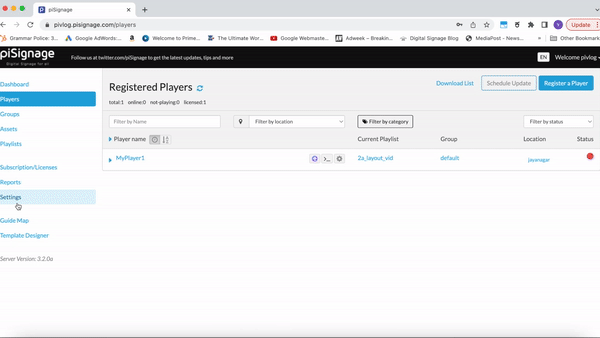Log into your primary PiSignage account—this serves as your master account where all players and assets are managed.
