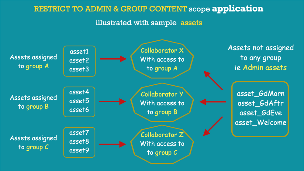 Restrict to Admin and Group Content: Collaborators access both their assigned group content plus admin assets (unassigned content available to all).