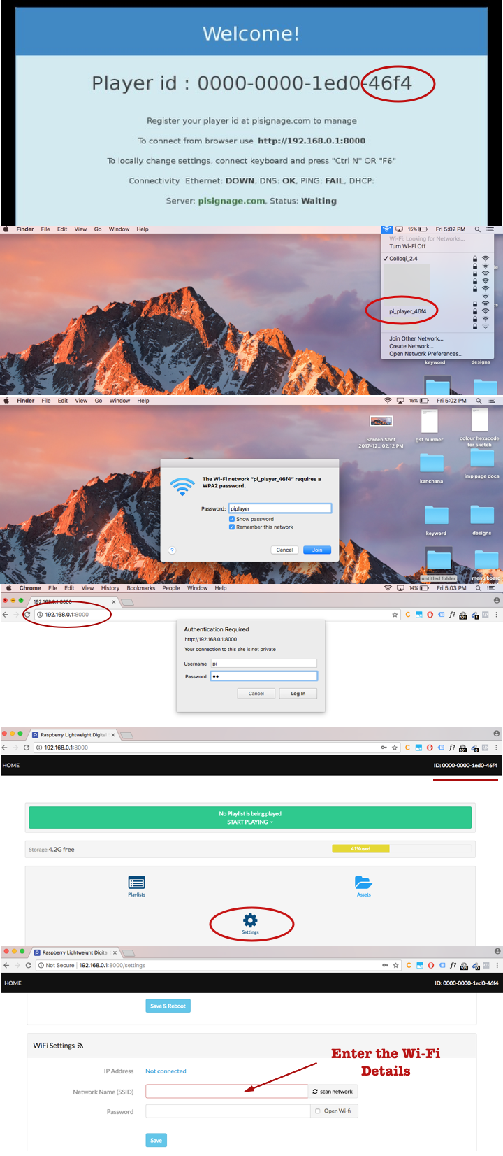 192.168.100.1:8000. This brings up the PiSignage player's local interface. - Login and configure: Use the credentials