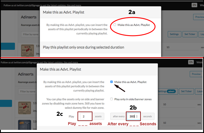A popup window will open (refer screenshots below) where you have to check the box Make this as Advt Playlist(2a). Enter the time interval (2c) at which the Advert has to be displayed and also enter the number of assets to be played at every interval (2b).