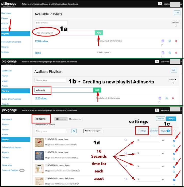 To explain with an example (refer screenshots below) we have created a playlist called Adinserts (1a,1b) in Layout 1 (1c) and have selected the required advert assets for the playlist (1d), 4 Image assets in this case. Each asset of this playlist will be displayed for 10 seconds. While we have created a new playlist here, a pre existing playlist also can be converted into ADVT playlist following the next steps.