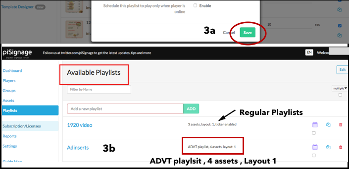 Leave all the next rows as it is. They are all used in specific use cases and we will discuss each in detail in a separate article . Scroll down and SAVE the settings (3a) and your ADVT playlist is READY (3b). Now you can add this ADVT playlist along with a regular playlist in a group, and display required advert contents between Regular display at specified time intervals.