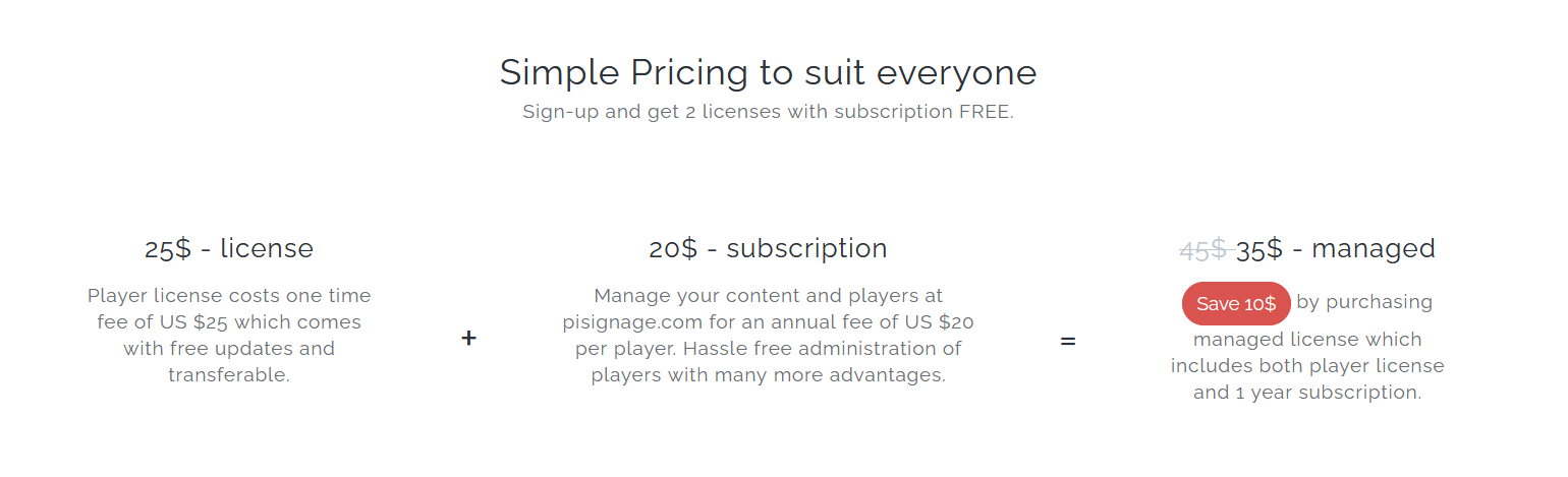 PiSignage costs $0 for your first two screens. From the 3rd screen onward, each additional screen is $35 in the first year and $1.67/month from the second year onward.