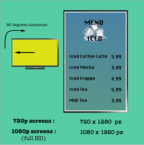 Layout 2ap helps you create a simple and effective display with a single zone in portrait mode, with your screen rotated 90 degrees in clockwise direction. While all the asset types supported by piSignage can be displayed here, Recommended dimensions are given below