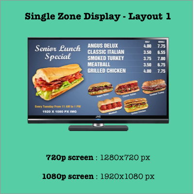 Layout 1 helps you create a simple and effective display with a single zone. While all the asset types supported by piSignage can be displayed here, dimensions available are given below.