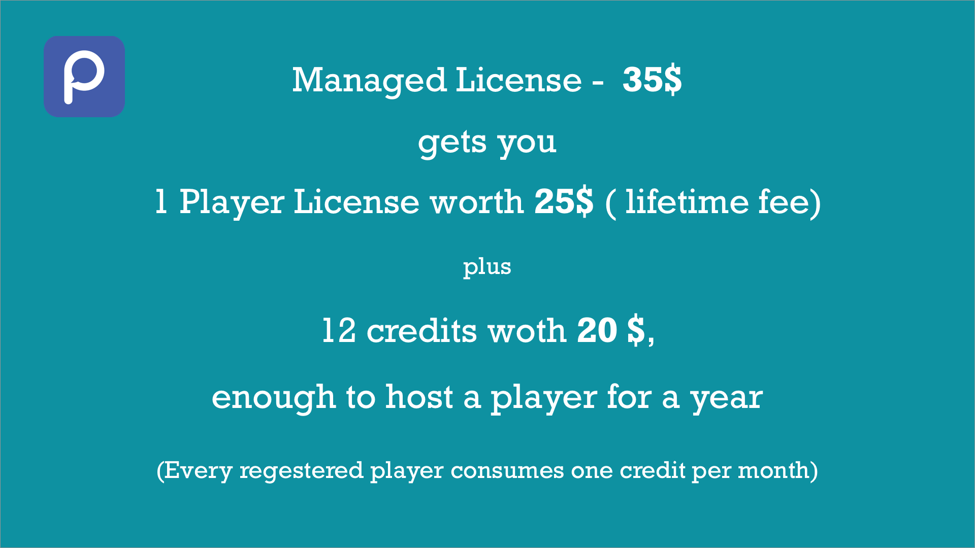 S0 with a managed license now at a special price of 35$ you get 1 player license worth 25$ and 12 credits worth 20$ with which you can manage your player for 12 months.