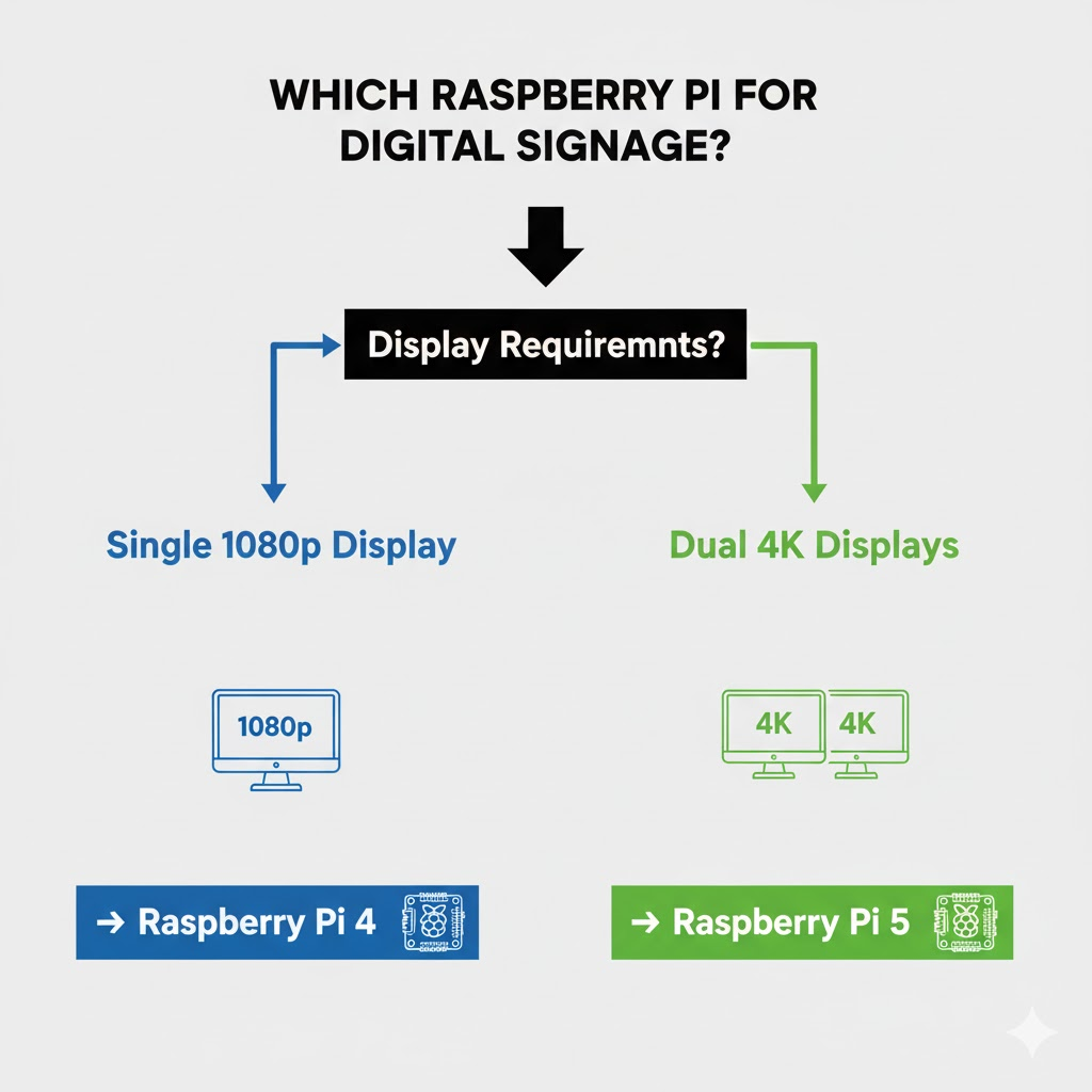 Bottom line: Choose Pi 5 for multi-location deployments, 4K content, or streaming features. Choose Pi 4 only for cost-constrained single displays with simple content.
