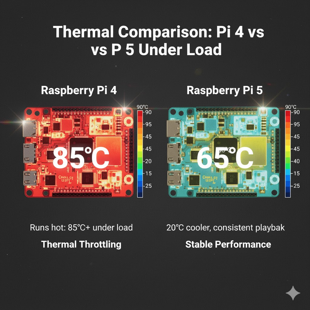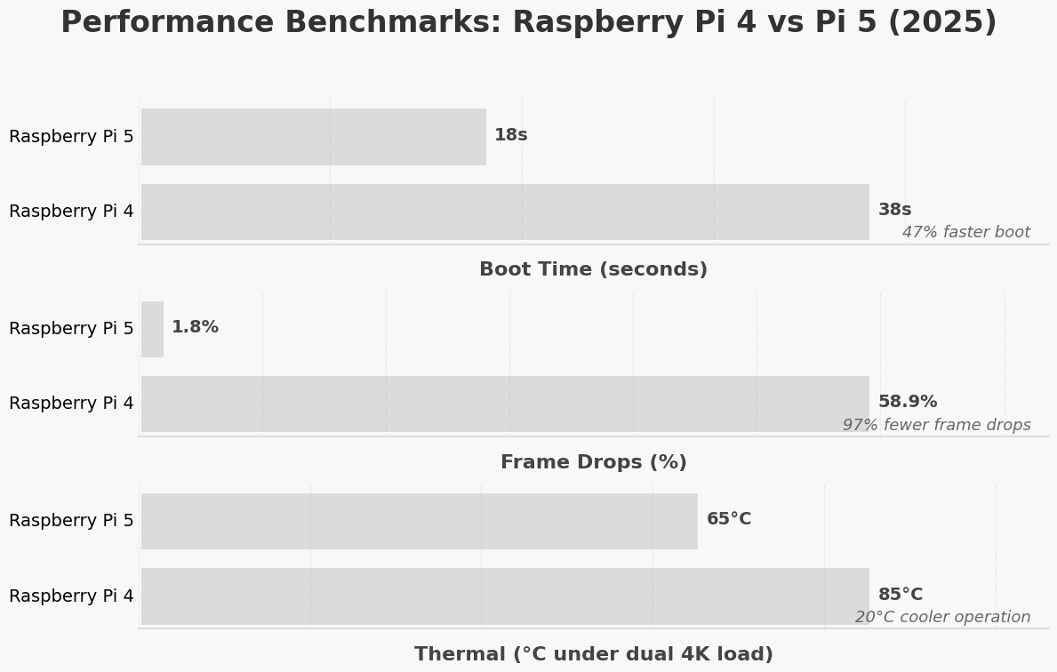 Pi 5 has 97% fewer frame drops. Pi 4 drops 58.9% of frames at 1080p60, creating visible stuttering. Pi 5 drops only 1.8% of frames, delivering professional-quality playback. For 4K content, Pi 4 struggles with thermal throttling while Pi 5 handles dual 4K@60Hz effortlessly while staying 20-25°C cooler. - How many displays can one Raspberry Pi power?
