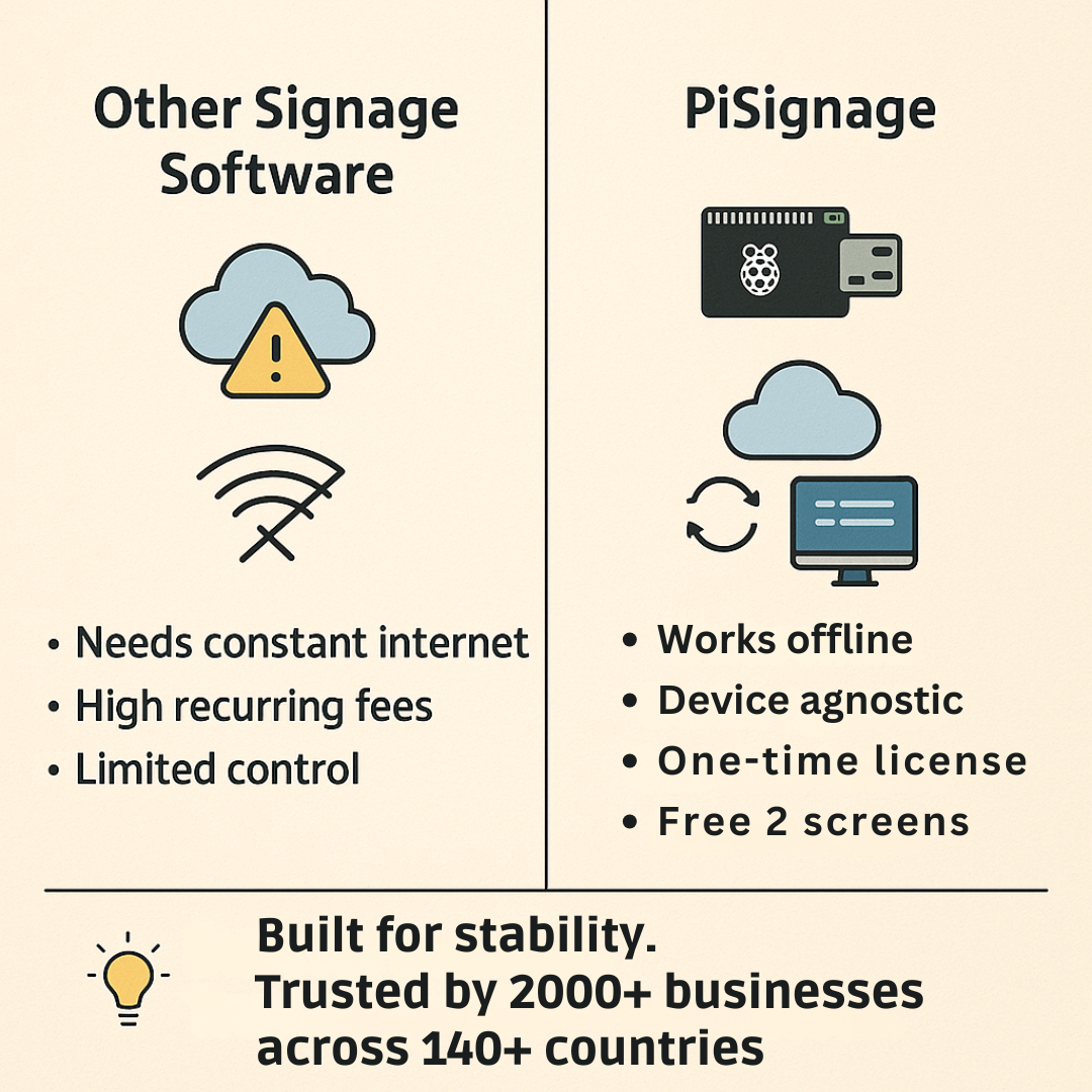 PiSignage advantage: Offline-first means network instability doesn't crash displays—only delays content updates.