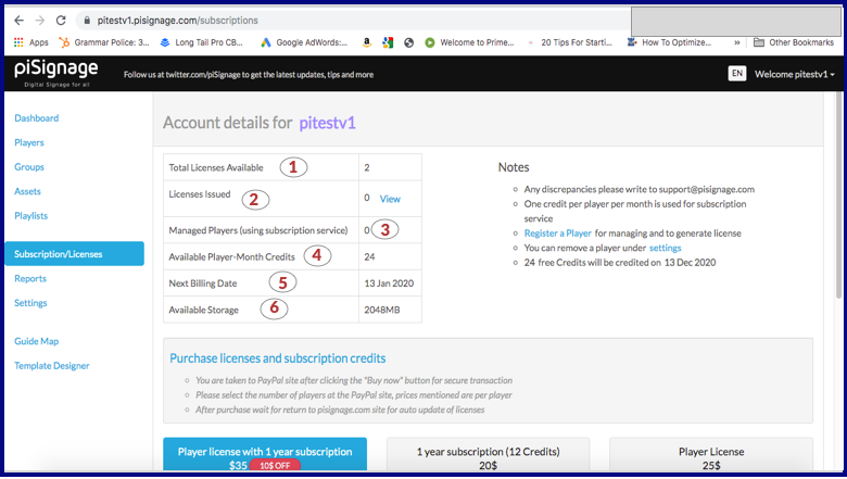 SUBSCRIPTION/LICENSES SECTION IN PISIGNAGE ACCOUNT